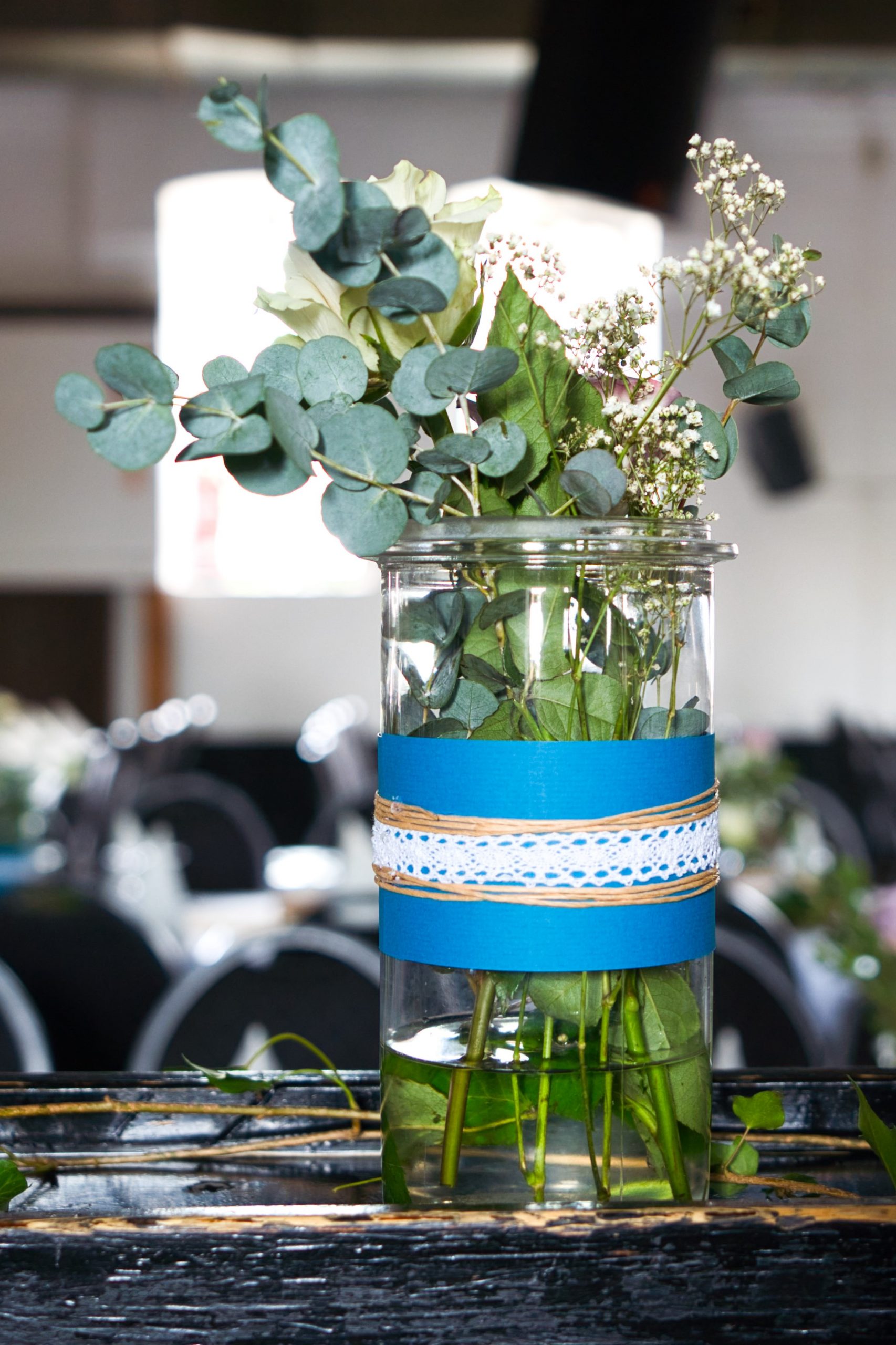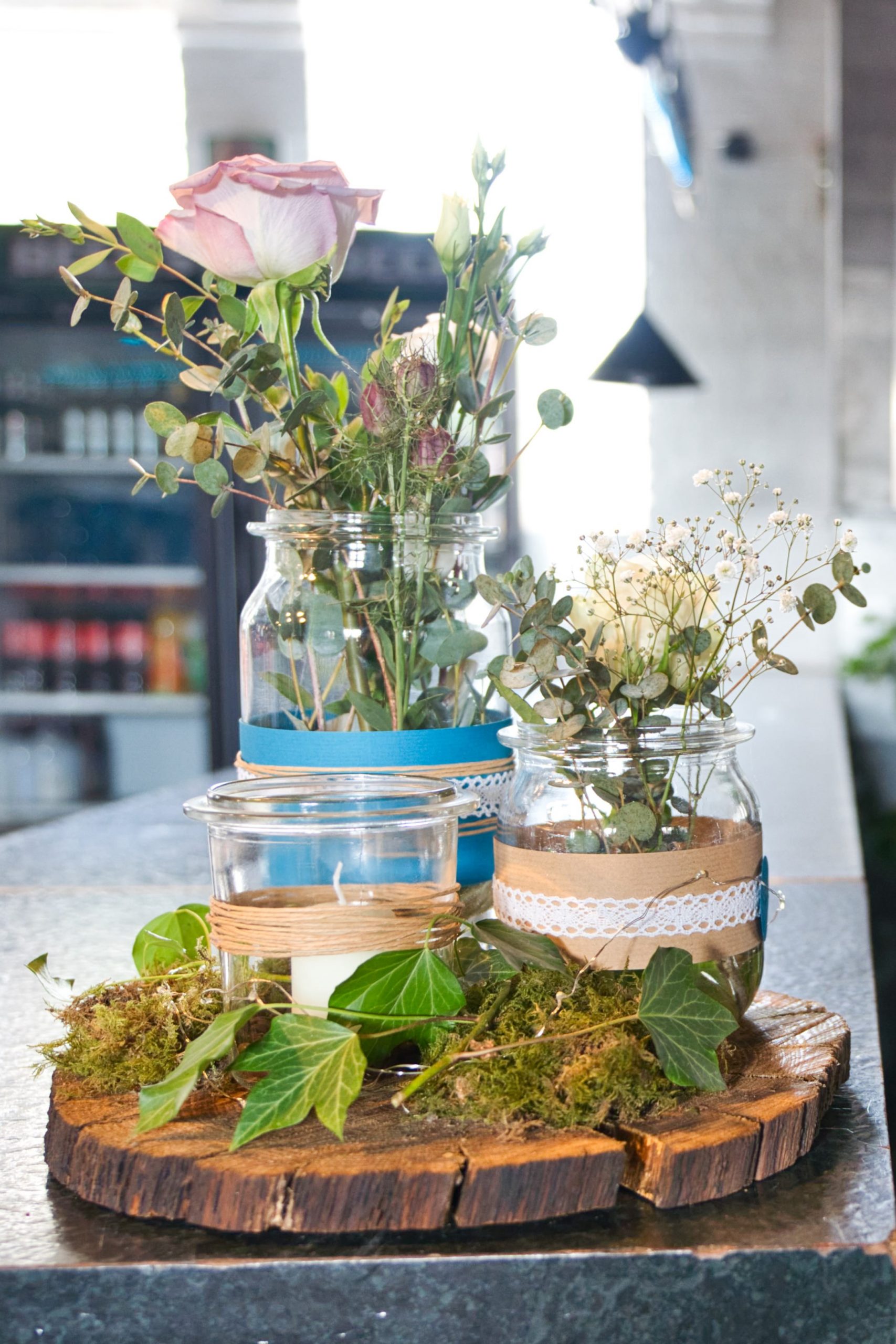 Die Kombination von Blumen (nicht von uns), Gläsern und den Holzscheiben stellt mit einfachen mittlen eine wunderschöne Dekoration dar!